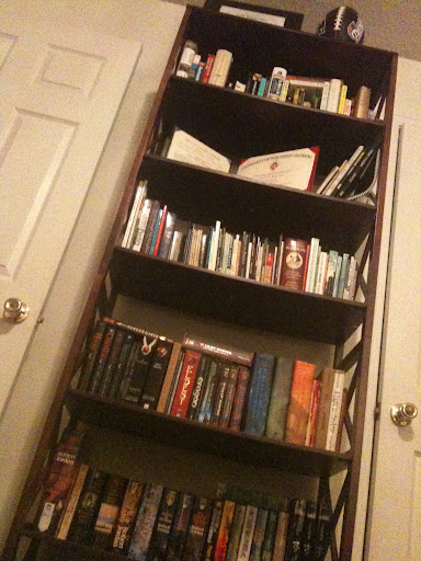 Below this is my sci-fi/fantasy shelf. Robert Jordan, Tolkien, books about dragons…yep, I admit it. I’m a geek. I’ve also read all of the Game of Thrones and Outlander books, but these are on my Kindle, too. I’d display them if I could. Proudly.