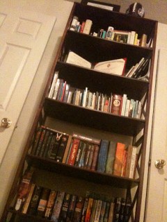 And hiding on the bottom is the first of many shelves of my extensive romance novel collection. These spill over into the other bookcase, and I’m sure it expresses some lack of self-confidence that I hide these books on the bottom shelf. After all, it’s not very intellectual to admit that you love Nora Roberts or Sandra Brown, but I do. THIS is where having a Kindle is a bonus; it’s super easy to buy trashy novels on the Kindle, and no one needs to see them but you.