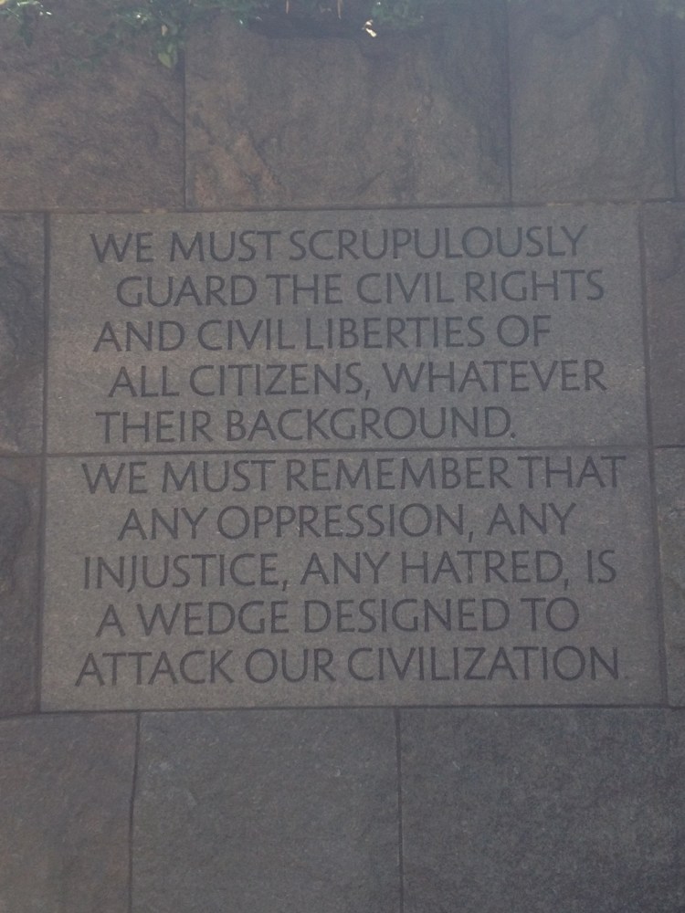 As I wandered alone, sometimes in respectful silence, sometimes amidst chattering tourists, I felt something I’ve never felt before when visiting DC. It might have been sadness, or at the very least, a healthy sense of un-settlement, mostly because the loft and inspiration of the monuments/memorials I visited seemed so incredibly out of touch with the quagmire of our politics today.