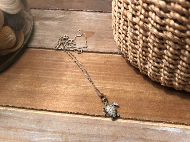 The turtle necklace was a gift to myself, purchased on my 40th birthday trip to Hawaii with a dear friend. I love sea turtles, and we saw so many of them on that trip. That necklace, to me, marked the beginning of a decade when I began to care less what the world thought of me (the ‘fewer-f#%ks-at-forty’ phenomenon), and I treasured it for the memory of that trip, too. And for the fact that I could wear it while hiking and it wouldn’t turn my neck green. π